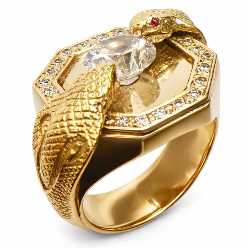 Masivní velký zlatý pánský prsten Kobry kolem poháru. Šestihranná zlatá číše, pohár s kamenem. Podoba, vzhled, jako rytuální prsten. Ručně skládaný prsten s mnoha částí. Kobry ve středu drží kámen.
